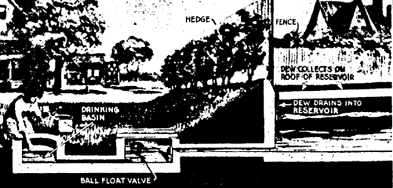 Nature does the rest, sometimes with a little help in the beginning. In time, the pond fills with rain water. The nest of straw serves as insulation, so that the clay shell and the water in it remain somewhat cooler at all times than the surrounding air. Dew condenses nightly on the cool clay banks, runs down into the little pond, and replaces moisture lost by seepage and evaporation.