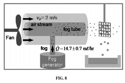 [0040] FIG. 8 is a schematic depiction of an artificial fog harvesting experimental setup. The experiments were carried out in a humidity chamber at T=26° C., and a relative humidity of 100% to eliminate the effects of condensation and evaporation of water.