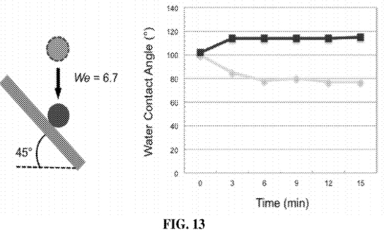 [0045] FIG. 13 is a diagram and graph depicting contact angles of water droplets on surfaces...