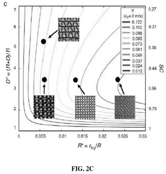 [0034] FIGS. 2A-2C are a diagrams depicting fog flow through a woven mesh surface, and a contour plot of the fog harvesting efficiency. FIG. 2A is an illustration indicating the stream surfaces of fog laden wind and their divergence after passing through a woven mesh surface. FIG. 2B is an enlarged drawing focusing on the interaction between incoming fog droplets and a horizontal mesh element. FIG. 2C is a contour plot of the fog harvesting efficiency (η) s a function of the ratio of radius of the fog droplets to the radius of the wire (R*=r fog/R) and the spacing ratio of the woven mesh (D*=(R+D)/R).