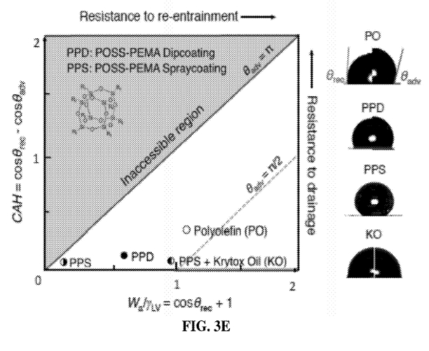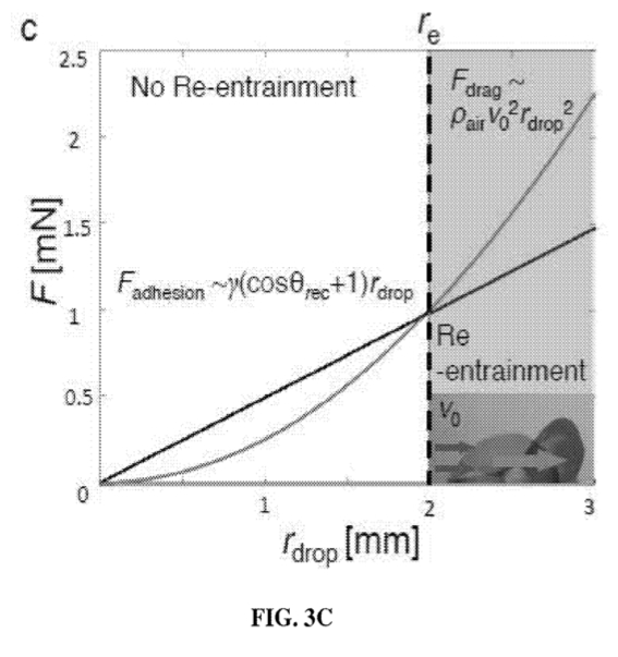 [0035] FIGS. 3A-3E represent two factors that reduce collection efficiency, and the surface modification design space that depicts the relative resistance to re-entrainment and drainage. Two factors that inhibit fog harvesting and reduce collection efficiency are ( FIG. 3A) re-entrainment of collected droplets in the wind and ( FIG. 3B) blockage of the mesh. FIG. 3C shows a plot that identifies the range of droplet sizes where the forces of adhesion dominate the drag forces, and establishes a criterion for a threshold droplet size for re-entrainment. FIG. 3D shows a plot that represents a second constraint arises from comparing the weight of the droplet with the surface pinning force arising from contact angle hysteresis. The threshold size where gravity dominates hysteretic pinning can be decreased by minimizing CAH=cos θ rec−cos θ adv. FIG. 3E shows a graph depicting the design space constructed from two dimensionless parameters related to work of adhesion (abscissa) and contact angle hysteresis (ordinate) depicts the relative resistance to re-entrainment and drainage. Measured values for droplets of water (V ″10 μL) deposited on several different coatings are shown in the plot. Wetting characteristics corresponding to a higher work of adhesion and lower contact angle hysteresis are ideal for the maximum fog collection efficiency.