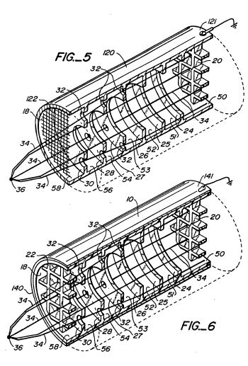 filaments 34. The holes 32 formed in rings 24-30 help keep the