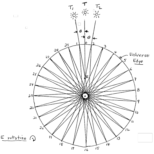 1. T is the Optical Position of the Sun, Point 02. T1 is the True Gravitational Position of the Sun, Point 13. T2 is the Reflected Gravitational Position of the Sun, Point 24. T-T1 ~ 8.3 minutes Time Difference5. Earth is assumed at Position E6. A spherical Euclidian Universe is assumed (Rhysmonic Cosmology)7. AngleOis very small!8. For ease in depiction, a large angleOis used; thus, only about 30 gravitational reflections are shown. In reality, many, many reflections occur! Also, for ease in depiction, a planar condition is shown.Figure (1) is a simplified depiction of how Kozyrev may have observed stars gravitationally. There I use our Sun as the star. Kozyrev observed that when his system was optically aligned with the star, a weak response was seen (even when optically shielded). If, however, he moved the telescope slightly to one side of the optical image (East or West?), he noticed a much increased response! He reasoned that this type of response could be due to the fact that the gravitational (torsion field?) "propagation" must be many orders of magnitude faster compared to the slower EM field weak response of the optical image. Thus the gravitational image response would "appear" before the optical image response. Moreover, he also noted a similar response when the telescope was "panned" equally to the other side of the optical image! He had no explanation for this other than to say that this was a "future" position of the star. In Figure (1) I give the Rhysmonic explanation.Rhysmonics postulates the Universe to be Euclidian in geometry and spherical in form and also to perfectly reflect all forms of radiant energy from the Universe edge. I believe the Earth to be located in a position somewhat inside the outer edge of the central "material" portion of the Universe (See my Rhysmonic Cosmology for more details). Using this as a basis, the simplified planar sketch of Figure (1) explains his result. The Earth is shown as located at position E. Any gravitational impulse directed through the Earth and the Universe Center would reflect just directly back on itself and thus tend to cancel. However, any active gravitational impulse that does not line up with the Universe center will result in repeated reflections of the edge of the Universe as depicted in Figure (1). For example, in this depiction, when the Sun is in its actual position, T1 (gravitational path E-T1), the Sun’s gravitational effects will "bounce" off the Universe edge 30 times before returning "instantly" to this same path and thus would be noted as an "additive" response in the system. But notice that a reflection point also appears at gravitational path E-T2 equidistant from the Sun’s apparent position also! This could well be the other torsion (?) image appearing in Kozyrev’s test?II. Conclusions ~1. While the gravitational impulses from our Sun would precede the optical image by about 8.3 minutes, the angleOwould be extremely small and possibly not measurable here on Earth. While I do not know on which star Kozyrev conducted his tests, it probably was quite distant for him to obtain a measurable angleO.2. Repeating gravitational phenomena have appeared throughout my many tests in Rhysmonics and had been reported to you in many Notes and articles (both published and unpublished)! That phenomenon is fundamental in Rhysmonic Cosmology. Such phenomena (in integrated form) may be the basis of the Microwave background Radiation in the Universe. It can, however, be resolved into l/f and white noise components. I look at these components as the zero-point energy under consideration today. Of more importance, however, is the basic Rhysmonic G-field energy, which is really the sole intrinsic energy source of the Universe!3. Much of the repeating gravitational phenomena involve the rotation of the Earth, especially with regard to the g-fields of the Earth. One example is to "modulate" the g-fields by moving a mass, say at 100 Hz every 10 seconds. Do this for a minute or so. Due to the Earth’s rotation, these impulses will then repeat (based on the above depiction) every 10 seconds for may hours (at that location), even days, or until other Universe events finally dissipate (or mask) that energy.While simple GW detectors will illustrate the above effects, more elaborate GW detectors ("tuned" to the musical scale) will repeat simple musical tunes (as per Bill Ramsay’s Cosmic Organ)! Again, this will repeat for many hours after the "activation" of the simple tune had ceased!4. More effort is required (by others) to explore and utilize these simple techniques! How about you, my colleagues?