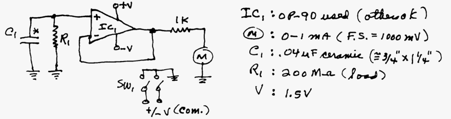 The OP-90 IC in this circuit has a very high input resistance (order of several thousand MOhms) but it is loaded down with a 200 MOhm resistor to keep the developed charge in C1 (due to G-field flux effects) from rising to saturation levels. With a +/1 1.5 V supply, I found the capacitor used would charge to the order of 650 mV. However, with the flat face of the capacitor marked *, when oriented as indicated below, numerous tests at the initial charge stabilization point indicated the following results: