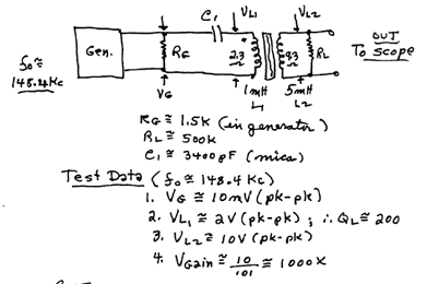 With the 20 MHz scope measurements, VG would start at about 1.5 V (pk-pk) and then sharply drop to about 10 mV at the resonant frequency of 148.4 KHz ad then return to 1.5 V (pk-pk). This verified the high loaded Q of 200 ! Thus VL was Q-multiplied! The VL2 voltage was simply transformer raised to 10 V. The power gains noted here should also have been in the order of 100 Q (plus) times.