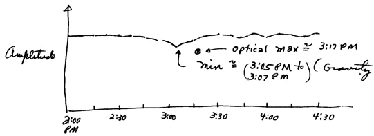 (3) The GW maximum again appeared about 8 or 9 minutes [ later ? -- apparently missing a word here – ed.] than the predicted optical shadow maximum.