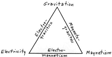 (2) The relationship between these three aspects of the long-range rhysmonic forces can be depicted as shown in Figure (1). There, electricity and magnetism are shown as forming the base of a triangle formed by these forces since these fields are fairly well understood and their vector field interactions (as electromagnetic effects) are also fairly well understood. However, rhysmonics shows that even here there are some aspects which are not well understood (or even recognized) by the conventional scientist. Gravitation is a more fundamental aspect (and thus shown as the apex of this triangle of forces), but it is also not well understood by conventional science. The scalar aspects of electric and magnetic fields is even less understood by the conventional scientist, while the scalar interaction of gravity with the scalar electric field and the scalar magnetic field is not even recognized by most conventional scientists. 20th century science and technology was largely based on electromagnetism, but 21st century science will include electrogravitic and magnetogravitic interactions, and thus will create much new technology which may even surpass the present day electromagnetic technology.