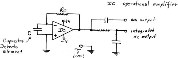(4) The capacitor element of Figure (4a) (or any other device which can develop polarization "currents" with scalar field interaction), may be used in the very simple detection system shown in Figure (5) below. The unit operates primarily as an electrogravitic device. Here, a scalar flux may "charge" the capacitor to some averaged dc value which may also have ac variations superimposed due to fluctuations in the scalar flux. Thus, this detector responds to all three variations in the scalar fields, but has been especially useful in simple gravitational signal astronomy systems.