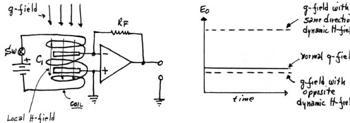 (2) For dynamic H-fields generated by the coil: when the collapsing H-fields are in the same direction as the g-fields, the apparent earth gravity field is increased tremendously. With a reversed collapse direction, very little effect is seen on the apparent g-fields.