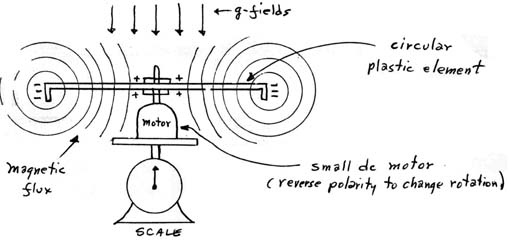 (2) With a clockwise (CW) rotation of the plastic element, the electrons on the rim are carried around by the rim at high velocities and thus are, in effect, a strong electrical circuiting current which thus creates a very intense magnetic field (H-field) in the central region of the disc. The H-field flux is directed down, in the same direction as the g-fields and thus are "attracted" by the g-fields. Therefore, the rotating element’s weight is apparently reduced.