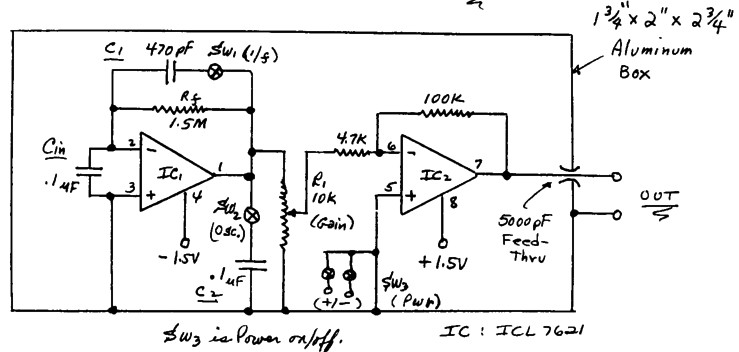 b. Oscillator mode is activated by closing black push button switch, SW2, to place capacitor, C2, across detector output.