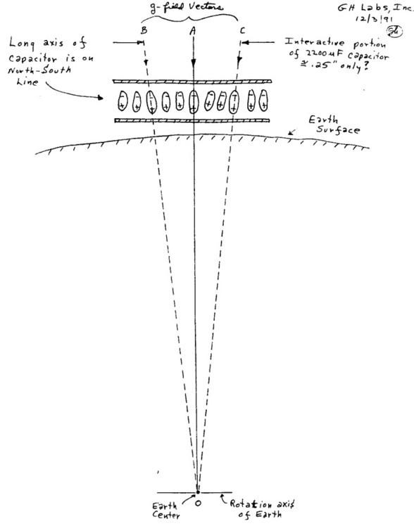 1. The detector capacitor is already ‘pre-polarized’ with the polarization a function of the capacitor geometry. For tubular capacitors, the earth g-fields will interact with only a small segment of the capacitor as depicted here. If the capacitor were oriented in the East-West direction, the tighter radial E-fields would show less interaction.