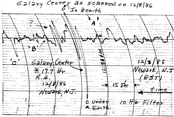 This is how the GC ‘looked’ in GW scans made prior to this date. The GC is in the zenith area in this scan and large masses in the zenith result in a reduced g-field and thus an up-scale reading on the strip chart. The responses A and BB are believed to be a rotating shock-wave wall of material blasted from the GC. The dense masses D may be separate masses, but are more likely a dense ‘accretion ring’ of material, with little mass in the central region. The mass C was noted in previous scans to be slowly moving toward the GC area. The capture of this mass may have precipitated the catastrophic event at the GC which was noted on 12-6-86 and thereafter.