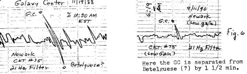 This scan continues to show the double holestructure on the GC meridian when the GC is scanned when in the zenith region. The two holes are only about 2-3 seconds apart here, but can be separated by minutes when the GC is under the Earth. Of importance here, is the evidence that the shock-wave ring A and B has expanded, compared to the positions shown in Figure 1.