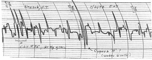 We began our ‘look’ by running a continuous 5-day 2-D scan of our meridian with Circuit #75 coupled to a Rustrak recorder. The purpose of this test was to see if we could ‘see’ any obvious repeating ‘structures’ in this scan period. Since each scan covers a slightly different region of the universe each day, only very strongly repeating structures were liable to repeat. Such a repeating structure seemed to occur at about RA of 19 hours and 20 minutes, and since it was always in the center of our scan sector, the probability was that it was in our zenith, i.e., in the Cygnus region! With the 2-second sampling rate of the Rustrak recorder, it is at best crude, but a definite structure appeared at this location on each approximately midnight scan, where this region was in our zenith! It is hard to see this structure, but when the chart is held at the correct distance it can stand out as a dark center with a white ring around it. It presently appears to possibly be two black holes (?) in orbit around each other, as the scans seem to change relative positions each day. Two scans from this test are shown in Figure (1).