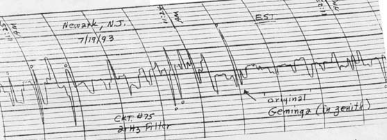 (a) Note: This scan was made under the same conditions as that shown in Figure (2) Note of 7-19-1993. The dense mass now collecting at the Galaxy Center again still does not appear to qualify as a 'black hole' yet. The pen of the recorder was drying out -- an attempt to refill it resulted in the 'blotting' seen above. Also note the corrected time in this scan; the time on 7-19-1993 was corrected for EST in the wrong direction!