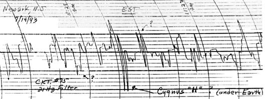 To confirm the reality of the scans of Cygnus H and the redeveloping "structure" at the Galaxy Center, these scans were repeated on 7-21-1993. As the plots of Figure (1) show, these "events" were largely duplicated. The galaxy Center response is essentially unchanged, but Cygnus H has changed somewhat --- but this was expected since the Rustrak 2-D plots seemed to indicate that this "event" was possibly two black holes in rapid close orbit around each other. This investigation was begum because we speculated that perhaps some "new" massive cosmic event might be generating fairly strong "gravity winds" which in some way were affecting the jet stream in the northern hemisphere. There was also a possibility that the rotating "holes" seen in the Rustrak plots were relatively close in the Cygnus area and may have had a phase relationship with the earth's rotation which could be keeping its maximum effect pointed toward a particular 40-42o North Latitude location and which is only very slowly moving across the Earth (in this case the USA?). To further look into this, I went over some past 2-D Rustrak scans I had remaining here.