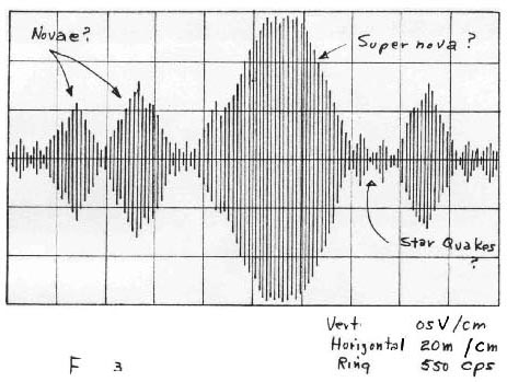 Another concept in the author’s cosmology inferred that gravitational collapse, such as supernova, should create a new kind of gravitational wave front (not the same as predicted in General Relativity) which would appear to the detector dielectric element as equivalent to an alternating electric field. According to current supernova theory (Ref. 4), this gravitational pulse should be Gaussian in amplitude, have a frequency in the order of 1 kc, and have burst periods in the order of 3-100 milliseconds. These bursts, according to the author’s cosmology, would also reach any portion of the universe in about 10-44 seconds, i.e., the pulses would be received in real time. Using an approximation of about one supernova per galaxy per 300 years, and about 90-100 billion galaxies in the universe, it was estimated that 10-15 bursts per second from supernova effects was reasonable. To optimize the detection of such bursts, the input capacitor was reduced to 0.22 uF in order to ring the circuit at about 500 cps for a broad resonance with such effects. It was now possible to ring the circuit with the perturbation mass of a pin point as shown in Figure (1a). The entire circuitry was double-shielded in an aluminum box within another steel box to eliminate electromagnetic fields from affecting the detector. Strong burst-type pulses continued to be detected, even when additionally shielded within another steel cabinet. These pulses have been continually observed by the author ever since the first experiments in 1975. many detectors have been built by the author, some by select colleagues, and all detectors performed similarly. In multiple detector tests, coincidence of bursts was noted. The observed bursts are Gaussian in amplitude and are in the order of 3-100 milliseconds long. A typical single sweep of bursts as seen on an oscilloscope is shown in Figure (3). The burst amplitudes are an inverse function of the frequency of the bursts, i.e., the greater the amplitude, the lower the frequency of such bursts. Relative amplitude and frequency of detected bursts is plotted in Figure (4a). The typical response of l/f noise in transistors (Ref. 5) is ploted in Figure (4b) for comparison. The similarity in plots is quite evident.