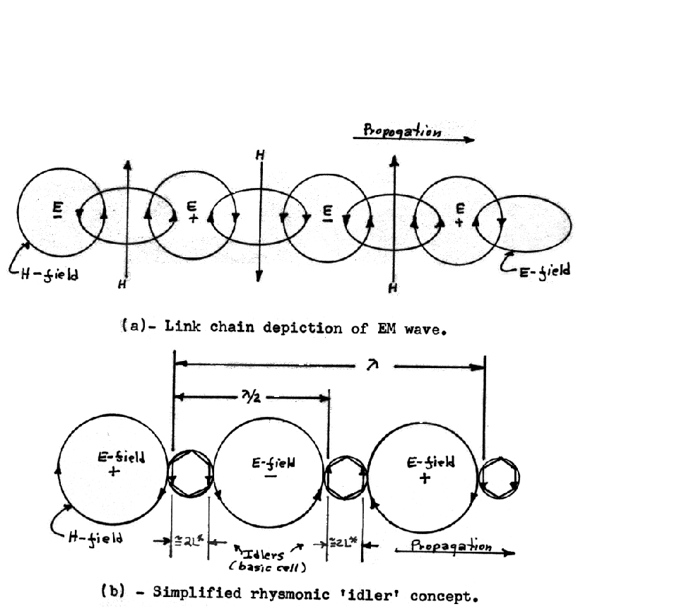 The simple circuit of Figure (12) actually demonstrates the indistinguishability of all three aspects of rhysmonic directed vector flux fields: the electric aspect, the magnetic aspect, and the gravitational aspect. All are directed rhysmonic vector fields, but each is generated by a different process and thus only appear to be a different entity. Electric fields are rhysmonic fluxes generated by vectors moving from excess rhysmonic regions to deficient rhysmonic regions. Magnetic fields are closed loops of rhysmonic flux, but in a short parallel segment of this loop, the flux is indistinguishable from the electric field. Gravitational fields are rhysmonic fluxes generated by the "screening" action of masses. As was indicated in these and other experiments, all three aspects can be made to appear simultaneously, with similar responses, in this one simple circuit, since they are really all the same basic entity.