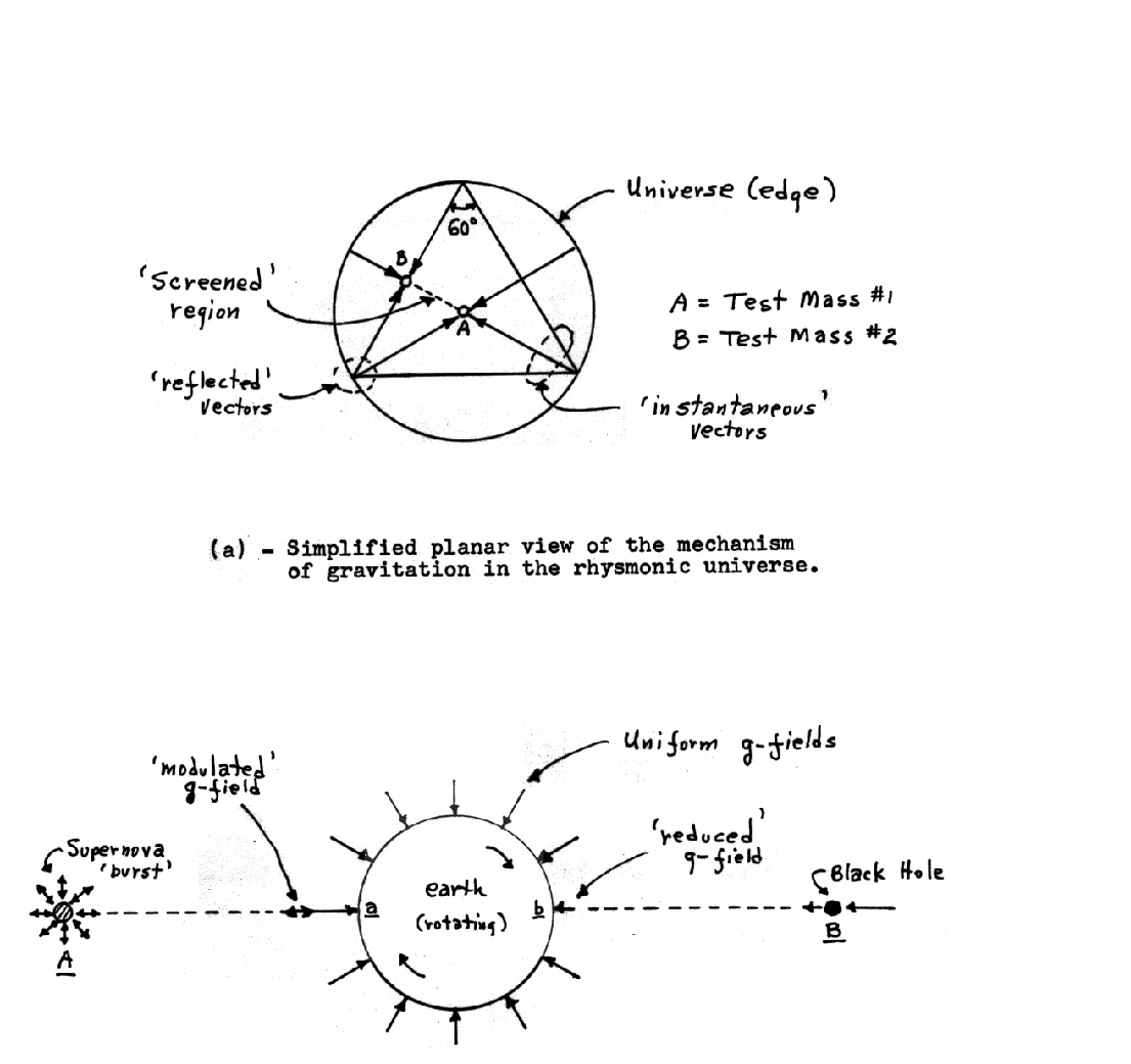 Two interesting observations can now be made. First, gravitation is basic to the matrix construction of the vacuum and thus is very fundamental as it does not depend on any other effect other than the "screening" action of masses in the universe. Thus, gravitation is really an "impelling" force rather than an "attractive" force between the masses. If the vacuum did not exist, neither would the phenomenon of gravitation, even if matter "existed" in a void. Second, since these gravitational effects take place in Planck time, T*, with instantaneous rhysmonic vectors existing in this time period, "action at a distance" is in effect restored in this universe. Electromagnetic effects, which proceed at the speed of light, C, do not play a part in this action. However, since gravitational fields are rhysmonic flux fields, the same as electric fields are also rhysmonic flux fields, both can transfer energy between distant objects in the process called induction, which really involves monopole "waves" between them. It must be remembered, however, that in the case of the electric field, the rhysmonic flux is due to the presence of charge in the universe, while with gravitation, the rhysmonic flux is due to the presence of shielding masses and charge is not a requirement. A commonly observed flux due to this shielding action is the earth’s gravity.