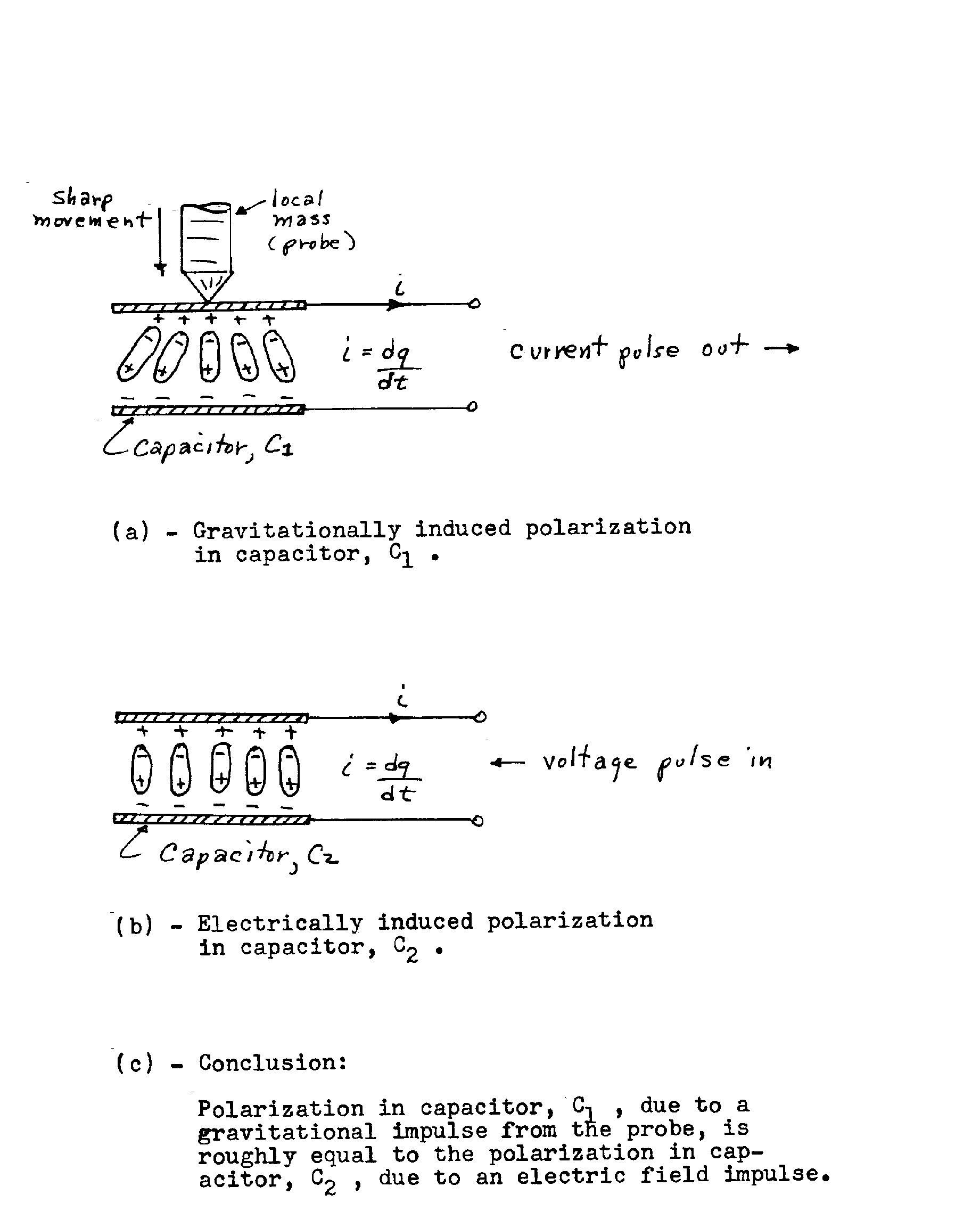 Figure (15) depicts the equivalence of electric and gravitational fields through their effects on loosely bound electrons in a capacitor. The electrons are "moved" by gravitational impulses (rhysmons) created by the sharp probe movement in very much the same fashion that the electric field (rhysmons) created by the battery can "move" these electrons. It had been shown by the author (see references of Appendix III) that supernova should create relatively strong monopolar gravitational impulses, i.e., rhysmonic vector impulses, which are oscillatory in nature, and thus should appear to this capacitor as equivalent to an alternating electric field. The resulting perturbations on the loosely bound electrons creates small impulse currents which can be amplified tremendously and converted to voltage fluctuations in the circuit of Figure (12) as described in the last chapter and as further discussed in some references of Appendix III. Therefore, electric fields and gravitational fields, under certain conditions, are indistinguishable from each other (as demonstrated in this test) since they are really the same entities.