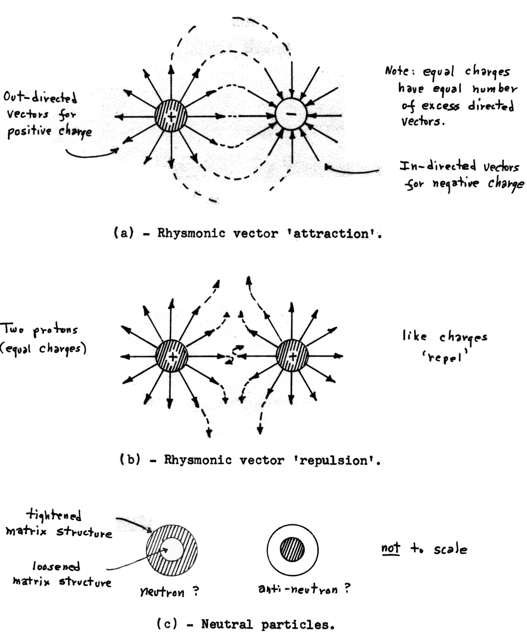 hquantum of action. In a pure rhysmoid, these energy vectors cancel and no phenomena exists. Any modification or disturbance in this structure results in phenomena known as particles or fields.Rhysmonic Particles: These are localized structures in the rhysmos where there are excesses or deficiencies of rhysmons in the matrix structure as compared to that of the pure rhysmoid. The geometry of these structures could be very stable, forming the known masses of the universe, or transitory, forming the many short-lived splinter particles of physics.