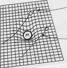 (1b):Einstein Gravitation: (top) Curved path of a small particle around a larer mass due to the warping of space-time in the region around this more massive particle, M.; (bottom) Path of a small particle in space-time in the absence of the more massive particle, M.