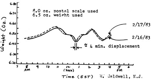 Balance Scale Gravimeters: These are, in effect, simply very sensitive spring balances in which the change in weight of a fixed mass is measured. It is shown in its simplest form in Figure (3b). A somewhat practical form of this type of gravimeter is provided by a well-made postal scale which reads but a maximum of 8 ounces. Such a scale should be able to read to the nearest 0.01 ounce. That such a scale is a valid gravimeter is seen in Figure (3c) where the unit responded to a major cosmic mass structure which always appears in the Leo region of the celestial sphere. Note the diurnal repeatability as seen with this simple device. More on this later. Some digital type scales (based on Hooke’s Law, e.g., springs) may also serve as simple gravimeters.