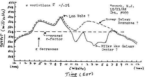 Another use for such gravimeters has been in the detection of the many supernova events occurring in this universe. Such events are best detected with reduced filtering in the output of the detector units. Presently, the author is concerned with the possible demise of the star Betelgeuse in the constellation of Orion. The Galaxy Center event of December 6, 1986 apparently triggered another very strong supernova event which appears to lie on the same meridian as Betelgeuse. Since gravitational impulses are essentially instantaneous, the optical, i.e., electromagnetic effects, from a possible demise of Betelgeuse will not reach us for about 300 years, since Betelgeuse is about 300 light years away from us. However, if such an event did indeed occur, then we are in for one ‘helluva visual supernova’ at that time!