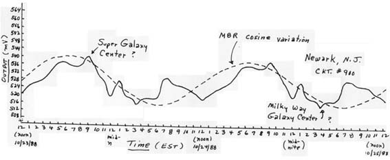Since the dense structures in the universe are ‘seen’ on a daily basis, the response shown in Figure (5b) is shown extended for a 48 hour period in Figure 6. Plotted in this way, the response illustrates very well a cosine-type variation which also correlates very well with a cosine-type variation in the microwave background radiation levels which have been determined by a number of experimental astrophysicists in the past. These evaluations strongly suggest that the so-called microwave background radiation is but the heating manifestation of the gravitational impulse background in the universe and thus the two are one and the same. Thus this may be an alternate explanation of the background radiation rather than the so-called Big Bang theory.