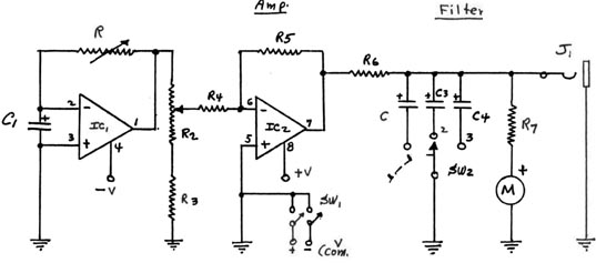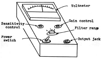 Three levels of output integration in the output filter are provided by the selector switch, SW2, which was made of the shorting type in order to progressively sum the capacitors in the filter unit. This was done in order to conserve capacitor space in the portable unit. However, the researcher or experimenter may add additional capacitance, if desired, by means of the output jack, J1. This jack is normally used to provide an output to an external meter device or some recording unit, such as a strip chart recorder or a computer.