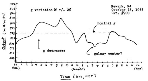 It may be better to keep the filter in position #3 for most earth gravitational field experiments. Shown in Figure (4) is a typical 24-hour response in the earth’s gravity field as detected with this unit. It will be noticed that there is a 12-hour variation in the response at times, and most of the variation and some ‘structure’ may be related to some possible ‘super’ black holes located in the ‘center’ of our universe (See Ref. 3).