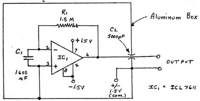 The scalar field detector used by the author in the experiments described in this article is very simple and is shown in Figure (1). It is l/f noise type detector and uses a Cmos op-amp which operates with a 1.5 volt supply. The unit is assembled in an aluminum box with self-contained batteries and the output is brought out with a filter type feedthrough in order to eliminate possible response to RF type ambient signals.