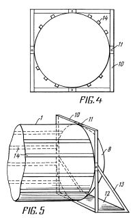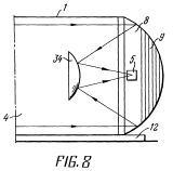 [0008] system's reflector. FIG.6 shows the device for transmitting a natural information supply having a chamber of a spherical form. FIG.7 shows the device for transmitting a natural information supply to a biological object having a chamber of elliptic section. FIG.8 shows the second antenna system supplemented wit:h an additional mirror. The Preferred Embodiment of the Invention The device for transmitting a natural information supply to a biological object comprises 2 chamber assembly having housing 1 made, for example, of duralumin and two antenna systems. The first antenna system is a receiver of a bioelectromagnetic radiation and is secured to one side of housing 1 forming, together with an adjacent part of housing 1, compartment 2 for reception of an information supply from source 3 of biofield. The second antenna system serves for reception and di- rectional transmittance of a bioelectromagnetic radiation and is secured to the opposite side of housing 1forming, together with an adjacent part of housing 1, compartment 4 for influencing biological object 5. The first antenna system comprises reflector 6 and microwave lens 7 mounted coaxially with it. The second antenna system comprises reflector 8 and microwave lens g mounted coaxially with it. Housing 1 may have a cylindrical form (FIG.l). Said antenna systems should be secured to its end sides. In doing so, it is recommended to use reflectors 6,8 hav:ing a parabolic form. Housing 1 may have such a design that together with said antenna systems, secured to its opposite sides, it forms a spherical chamber (Fig .6). Housing 1 may have such a design that together with said antenna systems secured to its opposite sides it forms an elliptic chamber (FIG.7).