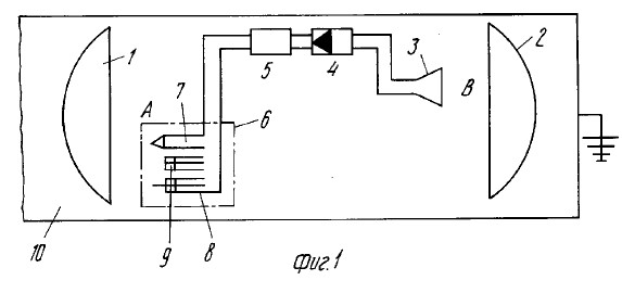 Here, the receiving antenna 3 the microwave oscillation is in the focus of the reflector 2, and all the elements of the device installed in the grounded shielding chamber 10.