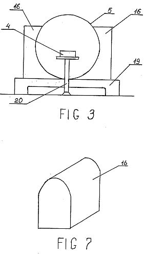 [0009] Each reflector 6,8 is secured by its end side to mounting frame 10 (FIG.4, 5) by means of eyes 11. Said frame has a support system comprising plate 12, mounted on a foundation, and inclined columns 13. Each reflector 6, 8 at its edges has flanges to which are secured rods 14 which encompass cylindrical housing 1 to ensure its rigidity. Housing 1 has a support made in the form of bed 15. In housing 1 for compartments 2 and 4 are provided doors 16, 17 (FIG.2, 3) being a part of the surface of housing 1 and having for the cylindrical design of ) housing 1 a form of an arc. In spherical or elliptic designs of said chambers doors 16, 17 have the forms of a part of a sphere and a part of an ellipsoid respectively. Doors 16 and 17 are secured to columns 18, 19 by means of hinged joints (FIG. 2, 3). In compartment 2 in the zone of focus of the first antenna system is provided means for placing source 3 of biofield; such means may be designed in the form of movable shelf 20 (FIG.1, 2, 6, 7) having wheels 21. Shelf 20 is mounted on support platform 22 located opposite door 16. Platform 22 is secured on columns 23 passing through slots in housing 1 and is supported on said foundation. Platform 22 has side guides 24 (FIG.1, 2) for wheels 21 of shelf 20. Behind this assembly is installed a limiter of shelf movement (not illustrated,l. In compartment 4 in the zone of focus of the second antenna system is provided a means for placing of one or more biological objects 5; said means is made in the form of multiplier or single-tier bed 25 (FIG.1,6,7) supporting elements of which through said slots in housing 1 are mounted on said foundation. Housing 1 has floor 26 for people to move around. Supports 27 for said floor are located in such a way