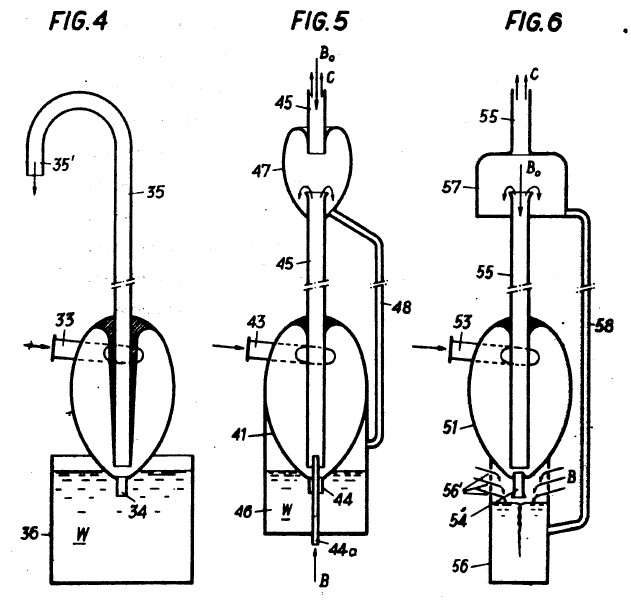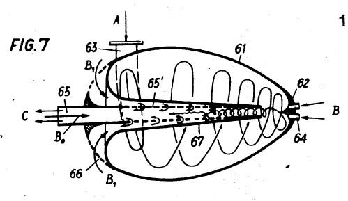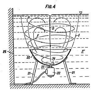 To restate the process briefly: axial->radial expulsion results in explosion,decay and combustion. Impulsion, or a radial->axial impetus results in implosion, ennoblement and autonomous upward displacement (levitation). In this case reactive suctional forces operate first during the ascent and are then reinforced by supplementary reactive forces. This is how physical weight is overcome naturalesquely, during which process the already higher-grade energetic ballasting elements are precipitated out and manifest themselves as falling and concentrating heat-forms. If this formative process is copied naturalesquely in a so-called Klimator (see figs. 27 and 28), which is suspended from the ceiling and moved bio-centrifugally then a falling and concentrating heat-form is produced with which the living space can be naturalesquely heated in winter. If these invigorative cold-forms with their rising and expanding properties are introduced into an evacuated glass bulb, then the energy-concentrates,which in any case move exceptionally rapidly, exceed their highest velocity in this resistance-less space. In the process they eject high-grade ballast material which interacts with the residual oxygen still present in an extremely rarefied state. The product of this renewed union is atmospheric space-light, naturalesquely copied sunlight as it were. This evolves and lights up the vacuum bulb when the bulb, which has no other connections apart from the earth-wire, is merely earthed. All that is required therefore is to connect the earth-wire in order to make the living space as bright as day. To extinguish this natural light, which is of course temperatureless, the earth-wire is simply disconnected. If virtually free mechanical power is required, then the above higher-grade heating effects merely need to be switched off, thus converting them into formative and levitative invigorative forms (cold-forms). This immediately reactivates the ur -- powerfully-waxing buoyant motion, which here should been visaged as a bio-magnetic up-current (a synthesizing current). With elemental force arising from an energy gradient that evolves along a common developmental axis, this up-current sucks up the generating device in its wake, i.e. it effortlessly overcomes its own weight. Aircraft, submarines orheavy projectiles can be propelled like lightning in this way at negligible cost.In stationary machines on the other hand, which must be well anchored to the ground, the indrawn air will be almost instantaneously decomposed, trans-formed and built up as described earlier by passing through a curviform pipe.The concurrently coincident water, i.e. the discharged and inwardly collapsed medium, will be expelled at the same time, resulting in the ur-generation of a high-grade high-quality space -- the organic vacuum. This is the opposite of atmospheric air pressure and is the best and cheapest attractional force to be found anywhere on this planet. It is also the space that produces ray-like forms which penetrate through al l enclosures and stream upwards.