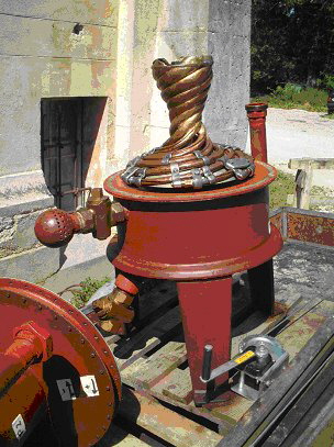 2. Is a diminutive, but faithful copy of the Earth itself, within which an agitator rotates, which is attached to the end of the vertical shaft. In addition, the Klimator consists of a series of nested, rilled, calyx-like ( 4 -- Calyx = the sepals of a flower collectively forming the outer floral envelope, protective of the bud. -Ed.) vanes, which are so constructed that the through-flowing masses, such as water and air, can be bio-centrifugated. Through the increase in centripetating and centrifugating velocities, which have hitherto never been achieved anywhere, increases in pressure and suction are produced, which reciprocally amplify each other exponentially. This results in the decomposition of the water and air due to the thorough trituration of the smallest molecules of sediment, leading to the development of a hitherto unknown process of synthesis. This gives rise to two longitudinally oriented types of inward flowing, spiral-like currents, one flowing upwards and the other downwards.