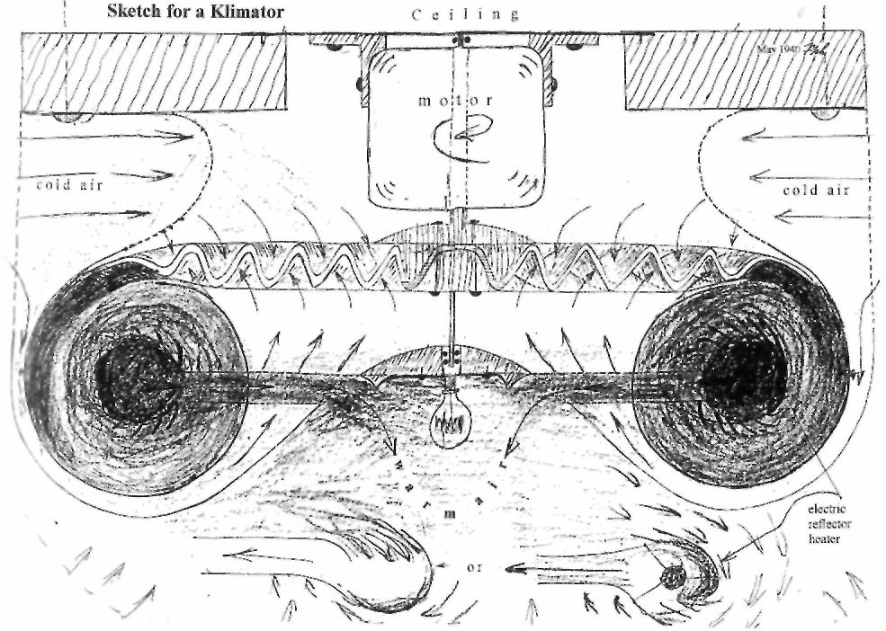 The primary product of synthesis, a biomagnetic formative and levitative current, will not be elaborated in more detail here, since we are primarily interested in the solution of the problem of heating, namely, with the function of the secondary or reflux current. This is a potential with which it is possible to heat up a space from the ceiling downwards, like the Sun does. It is a radiant form of heat, which heats the whole space evenly. If the intensity of the small heating resistance (element) is reduced, however, for which the rate of rotation of the agitator must be increased, then the living space is suffused with an evenly dispersed, rising, expanding and high-altitude-like fresh air. In this way the natural, reactive forms of temperature are produced nearly free of cost, through which the natural warmth of the valley-climate comes into being. It is a mountain micro-climate. The Klimator represents the most basic developmental form in which the natural, primary motive forces can evolve, whose two components are to be differentiated as: