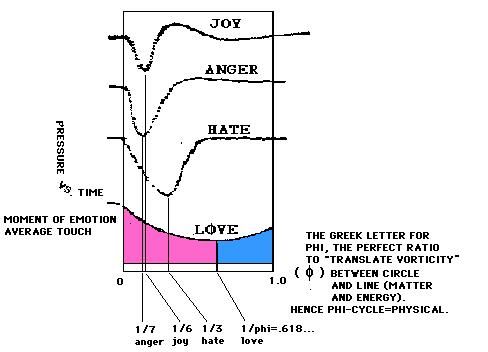 Expressing no emotion in this method is like the mechanical movement of typewriting: primarily downward, and slightly outward, away from the body. Anger is a similar emotion, but with reversed emphasis: outward movement is more pronounced than downward movement. Anger is a brief expression --- the finger returns to its original position in less than a second. Love is slower, and takes two seconds or more. Changes in pressure during love are gradual and smooth, and the horizontal tracings often show an inward, embracing movement. The form for sex is distinct from love.