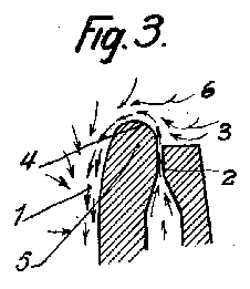 Figure 3 shows the checking of the surrounding fluid on one side of the stream by means of a flap 4 which prevents the flow of the surrounding air from space 5, and also the deflection, according to the arrows 3,of the issuing stream discharged from said nozzle.