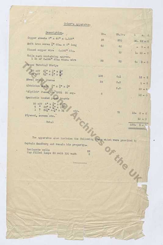 Coler was asked if he would consent to build models of these devices if material was made available. He agreed that he could do this, and stated that it would take one week to construct a "Magnetstromapparat", and a month to construct a "Stromzeuger". Accordingly we supplied the magnets, condensers and copper wire needed for the former, and Coler proceeded to build an apparatus as discussed in Section 3. A list of materials required for the "Stromzeuger" was drawn up by Coler.