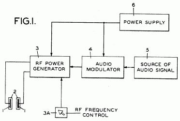 The device called the "neurophone" by Flanagan, was a very simple gadget. It used those ancient devices known as vacuum tubes. It used a 6L6G tube running as a 35 Kilohertz oscillator; the output of the oscillator was amplitude-modulated by the output of ant single channel hi-fi system through suitable impedance matching transformers, etc. This amplitude modulated 35 kilohertz signal then went through a cheapie stepup transformer so that the output was very high voltage (about 4 kilovolts, as I remember) but at very high impedance. Flanagan fed this signal through a length of ordinary TV antenna twin lead to a pair of rubber pads about six inches in diameter that he had filched from a "relaxicisor" muscle relaxing device. Each pad consisted of a 1/16 inch thick rubber sheet, a piece of copper window screen to which was soldered one of the wires of the twin lead, and the rubber covering of the relaxicisor pad. The rubber insulation kept one from getting zapped, although the shock wasnt painful....just annoying.