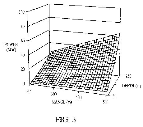 illustrating acoustic power requirement versus range and depth