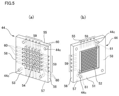 Next, the configuration of the partition plates 44 will be described with reference to FIGS. 5 and 6. One surface of the partition plate 44 is used as the anode-side surface 51, and in this case, liquid-fuel supply grooves 52 having a constant depth extending in a parallel manner at fixed intervals in which the two ends are in communication are carved inside the exterior peripheral rectangular frame portion having a constant width. The other surface of the partition plate 44 is the cathode-side surface 53, and in this case, air supply grooves 54 having a constant depth formed in a grid shape are formed inside of the exterior peripheral rectangular frame portion having the same constant width.