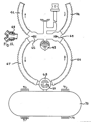 FIG. 15 shows such a proportioning valve in cross section. It will be seen that the rotatable central part can be rotated clockwise or counterclockwise to completely close either branch of the valve or can be positioned to vary the proportioning of the air flowing in the two left branches of the valve, or can be rotated to shut ofi? the fiow of air altogether. The valves 64 and 65 are identical in operation. The air hoses 66 and 67 connect the proportioning valves 64 and 65 with a demand regulator 68 which is of well known type widely used in self contained under water breathing apparatus. This regulator 68 also has a central push button, also well known in the art, for manually depressing the diaphragm of the demand regulator in order to pass air from the compressed air supply into the breathing circuit. is a conventional tank of compressed air and is equipped with the lugs '71 which are provided for attaching a harness to be worn by the diver.