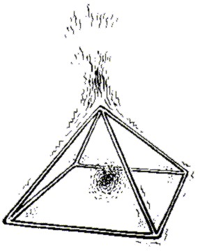 Cheops Pyramid --- Make a pyramid of 3-4 layers of thick, porous wrapping paper: 20x20 cm square base, ascending edges 19cm each. Glue it only at the edges, the tighter the better but, in a thin line. Cut out Make a 5-6 cm hole in the middle of one of the side faces. Hold a 10 cm long piece of drawing coal or a pencil in your fingers and insert this indicator into the hole, slanting its far end toward the bottom of the pyramid. "Stir" the space inside the pyramid with the indicator, take it out and repeat the procedure about 30 times. You will soon pick up an active zone, a "clot", where the Egyptians had their tombs. Another active zone (a flame) above the top of the pyramid is also well-perceived by the indicator if you drag its end over the top. The "clot" and the "flame" are well-felt by the finger inserted into he pyramid, or your palm moved above it after some practice. The pyramid effect, which generated many scary and mysterious stories over the centuries, is one of the CSE manifestations.