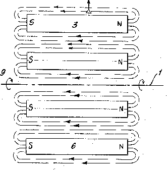 At the end of shell piece 23, remote from flange 25, there is provided a pair of slip rings 27 and 28 which, in the event the shell piece is formed of electrically conductive material, may be separated from the shell piece by sub-rings 29 and 30, of appropriate insulating material. The slip ring 27 is connected through a conductor 31 to the free end on the inner course of the solenoid winding for each of the electromagnets 11-22. The slip ring 28 is connected through a conductor 32 to the free end of the outer course of winding in each of the solenoids 11-22. All 12 solenoids are connected so that the direction of electric current flow is the same in all solenoids. The energizing current is supplied from an external source through conductors 33 and 34 and brushes 35 and 36, in a manner well understood in the art.