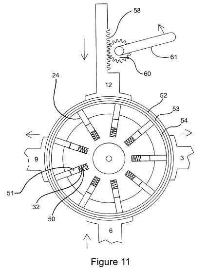 In FIG. 4, control pressure is injected into the control ports 26 for pistons 12 and 6 causing them to move radially inward. Any other mechanical means of control, such as rack 58 and pinion 60 actuable by lever 61 as shown in FIG. 11, would act in a similar manner to the pressure and cause pistons 12 and 6 to move radially inward due to external mechanical force. The spring action of the flexible band causes it to bulge out in equal measure against the pistons 3 and 9; while causing those pistons to move radially outward while exhausting the control fluid volume out through control ports 26. The use of mechanical control here would require that the mechanical control means would retract to allow for the spring action of the band 14 to push pistons 3 and 9 outward. The arrows at the control ports 26 show the direction of fluid flow. Now for this discussion, a clockwise rotation is chosen. FIG. 4 also shows maximum deflection of the flexible band 14. Rotating vane chambers 34 and 35 are shown as minimized, while the chambers 33 and 36 are maximized. Since chamber 33 is removing a much larger volume of fluid from the first quadrant than the chamber 34 is carrying in, the difference must be provided via either kidney ports 23 or 16. Therefore, ports 23 or 16 are suction ports which can be connected to an external hydraulic circuit, and fluid is drawn into "quadrant one" through those ports. Chamber 33 is very large when it rotates into the second quadrant, and chamber 35 now is very small in exiting. The large difference of the volumes must therefore be forced out kidney ports 17 or 20 into the external hydraulic path. Ports 23 and 16, and 17 and 20 form a hydrostatic loop when connected to an external fixed displacement hydraulic motor. For reference, look at the schematic connection in FIG. 9. By varying the radial positions of the pistons 12, 3, 6, and 9, the fluid displaced can be fully controlled from zero to the maximum in any increment. Now, ports 18 and 21, and 19 and 22 will form a second Siamese hydrostatic loop when they are connected to a second external hydraulic motor. For like displacements of the pistons 12 and 6, and opposite and equal motion of pistons 3 and 9, the fluid flow through fluid circuit A which consists of ports 23 and 16, and 17 and 20 will exactly equal the flow through fluid circuit consisting of ports 18 and 21, and 19 and 22. This describes the case of straight motion for a set of vehicle axles. The simple case of ports 23 and 16 paired with 18 and 21, and 17 and 20 with 19 and 22, and then connected to a single fixed or variable hydraulic motor is also straight line motion. For reference, look at the fluid connection shown in FIG. 8. As the rotor, vane, and flexing band assembly rotate, the action of the elliptasized band will be to force the compression and extension of the vanes 24, with regard to angular position only. The pressure being applied to pistons 12 and 6 through ports 26 causes the pistons to move inward. For the clockwise rotation, output hydraulic pressure will escalate in the second and fourth quadrant chambers. As the chamber pressure increases, an increasing radial outward force develops on the underside of pistons 12 and 6, thereby reducing the respective piston inward force. When the outward force is equal to the inward force, the piston inward motion ceases. As the external hydraulic motor circuit responds to pressure and turns, the developed pressure drops slightly, and allows the pistons 12 and 6 to move slightly more inward, and this in turn increases the volume of fluid passing through the variable pump, in turn causing the motor to turn faster, thus causing a further line drop, causing more piston motion in, and so on. Therefore, the pressure developed in the quadrant chambers is equal to, or in proportion to the control force, and the variable pump automatically changes its displacement to accommodate changing external flow, while holding the out pressure proportional to the control pressure. Thus the hydraulic motor torque is a function of control pressure regardless of variable pump input speed and direction and output motor speed.