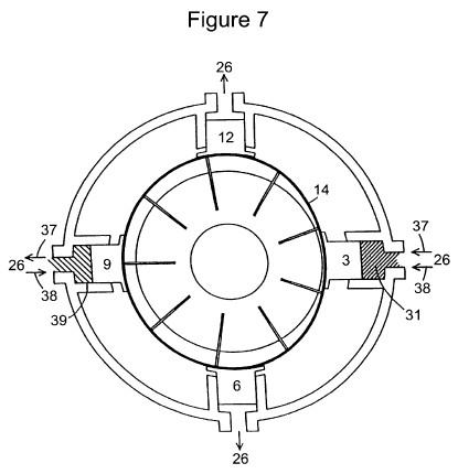 FIG. 5 depicts the opposite case of piston operation in that pistons 3 and 9 are pressurized, causing them to move radially inward. Pistons 12 and 6 are forced out and the ellipse flexible band major axis is now vertical. Swept chamber volume 34 now is large, as is volume 35, while volumes 33 and 36 are now small. There is now an excess of fluid entering the first and third quadrant chambers and kidney ports 23 and 16, and 18 and 21 become pressure ports, while a shortage of fluid in the second and fourth quadrants results in kidney ports 17 and 20, and 19 and 22 becoming suction ports and the hydraulic motor would now reverse direction. Note that in the case of FIGS. 4 and 5, if the shaft rotation of the pump input were reversed, the external fluid direction would also reverse and the manipulation of the opposed sets of control pistons, both the volume and direction of the fluid output can be fully controlled. Also note that by pressurizing the opposite sets of pistons to the pair shown in FIGS. 4 and 5, the subject pump can be used as a variable hydraulic motor. This is an ideal component for interface between an energy storage flywheel and road wheels. The device as a pump can also interface to a flywheel or electric motor including a pancake design motor and can act to use or recover flywheel or motor energy directly. During acceleration, the pump will withdraw the prestored kinetic energy from the flywheel and direct it to the road wheels so as to accelerate a vehicle. During braking, the opposite control pistons try to force the flexible band back into a circular shape and in so doing, cause the pump to behave like a motor which then will act to re-accelerate the flywheel to near its initial speed. During the braking action, straight line vehicle energy is recycled back into the flywheel and the vehicle is brought to a standstill. The braking action is the same for either a single output motor or two motors.